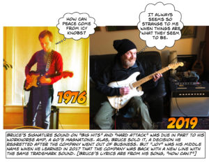 Although Bruce’s unconventional approach lost him record company support, he continued to record with MX-80 issuing recordings in 1986 (Existential Lover), 1995 (I’ve Seen Enough), 2005 (We’re An American Band), 2015 (So Funny), and 2021 (Hougher House). Bruce was employed for many years at Ameoba Records, and he recorded with Bay Area artists ranging from Henry Kaiser to Angel Corpus Christi. His close collaboration with MX-80’s Dale Sophiea formed the nexus for a series of experimental groups, including O-Type, The Gizzards, Brutality, Half-Life, Lazyboy, and Grale. His friendship with MX-80 vocalist, Rich Stim, led to three Bar Stool Walker recordings. In recent years, Bruce worked with the group Rattletrap and composed and performed a final MX-80 LP, Better Than Life, to be released in 2022.